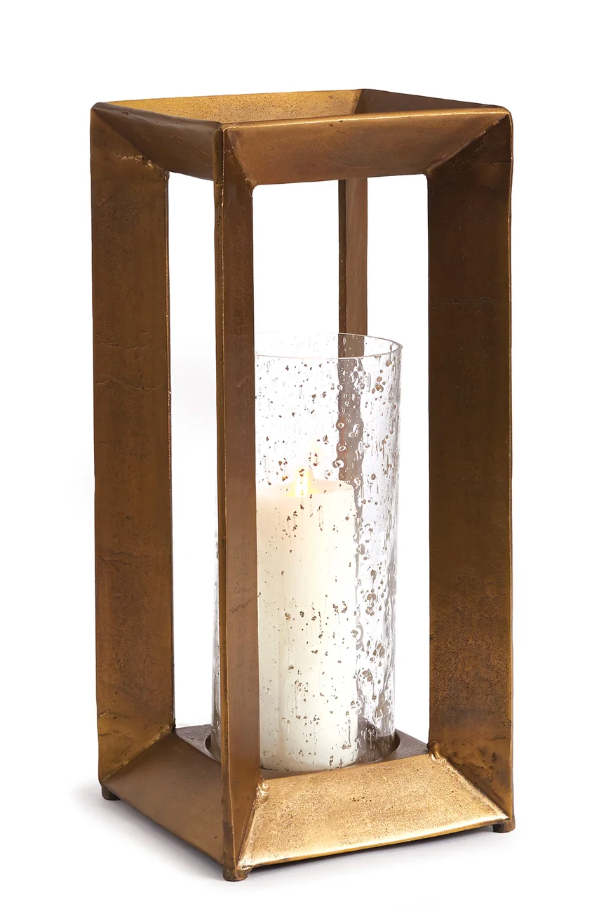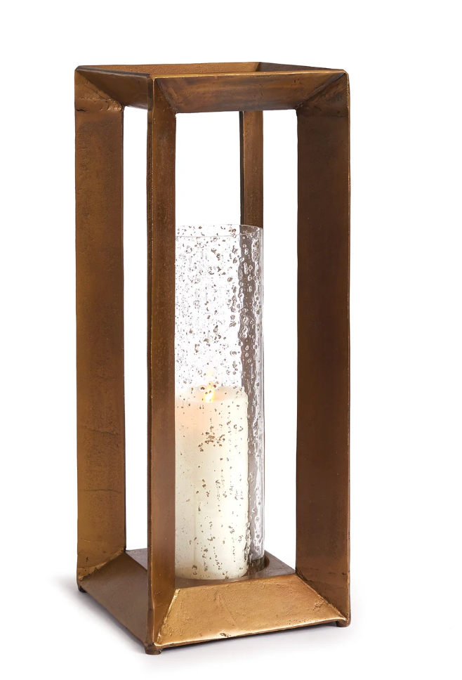 The Arial Hurricane brings timeless elegance to any room with its substantial cast aluminum construction and antique brass finish. This striking accent piece features a seeded glass insert that beautifully diffuses candlelight, creating a warm, inviting glow that transforms your space. Built to last with sturdy, quality craftsmanship, it's the perfect statement piece for those who appreciate both style and substance.