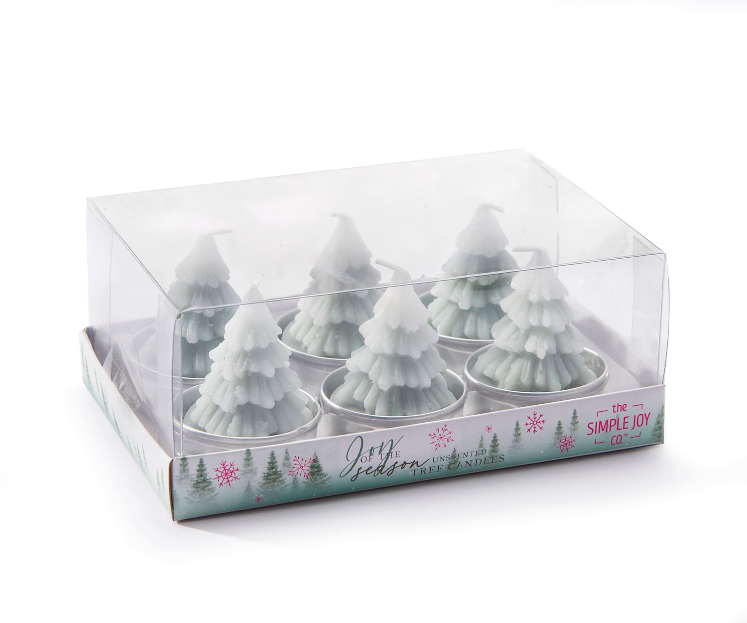 A festive gift for loved ones or a decorative treat for your space for the holidays, this set of Unscented Wax Candels are designed in the shape of Christmas trees and come in a gift box () with the sentiment JOY OF THE SEASON.