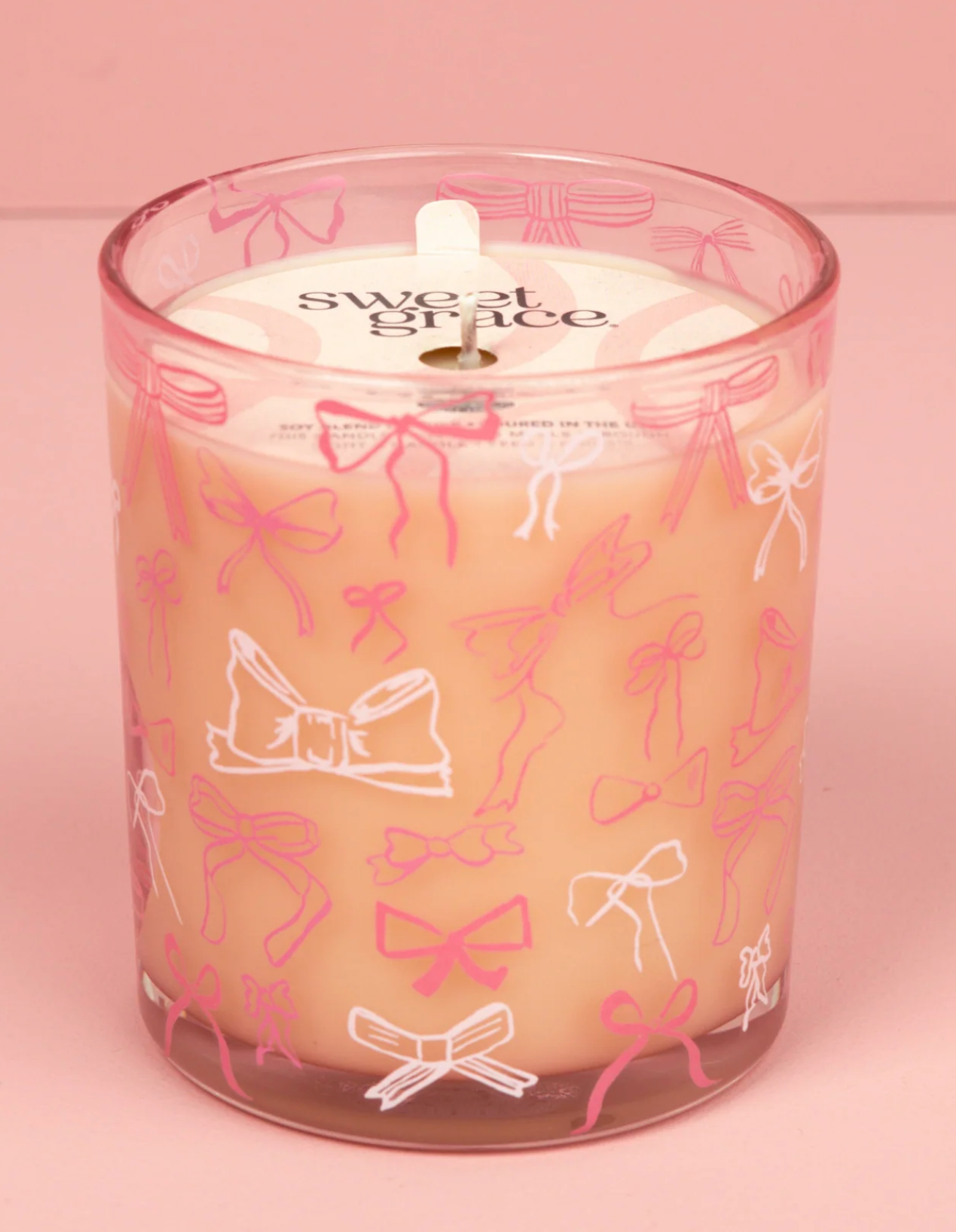 Add a touch of sweetness with the Sweet Grace Bow Candle! This adorable candle features pink and white bow decals on a clear glass jar, creating the perfect playful, pink-girl aesthetic. Filled with a soy-blend wax and our best-selling Sweet Grace fragrance, it offers up to 72 hours of burn time.