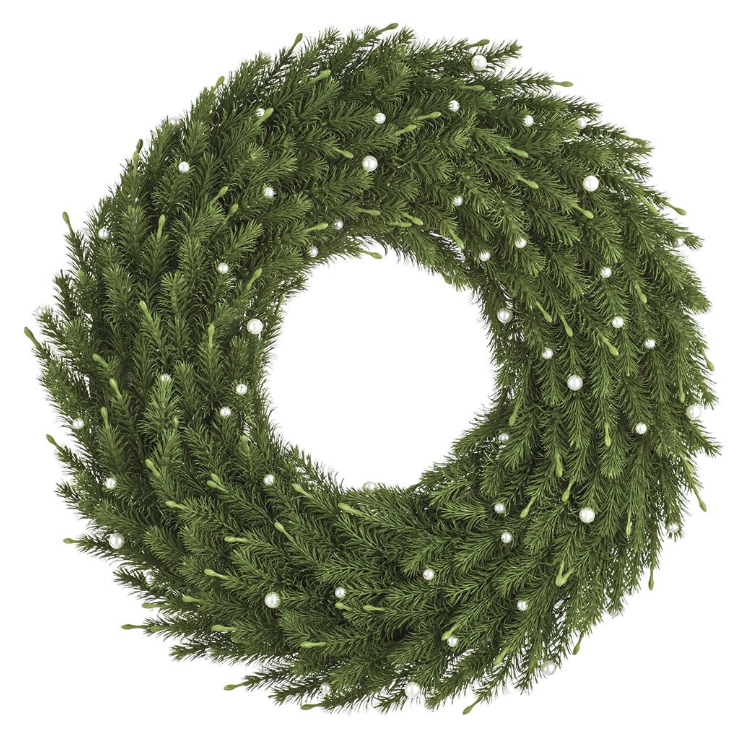 Celebrate the season with the timeless elegance of this Pearl Embellished Pine Wreath. Lush layers of realistic pine greenery are artfully arranged in a full, circular shape and accented with scattered white pearls, creating a subtle yet sophisticated holiday statement. Perfect for doors, mantels, or above the hearth, this wreath blends natural beauty with a touch of refined sparkle. Whether displayed on its own or customized with ribbons and florals, it adds festive charm to any space.