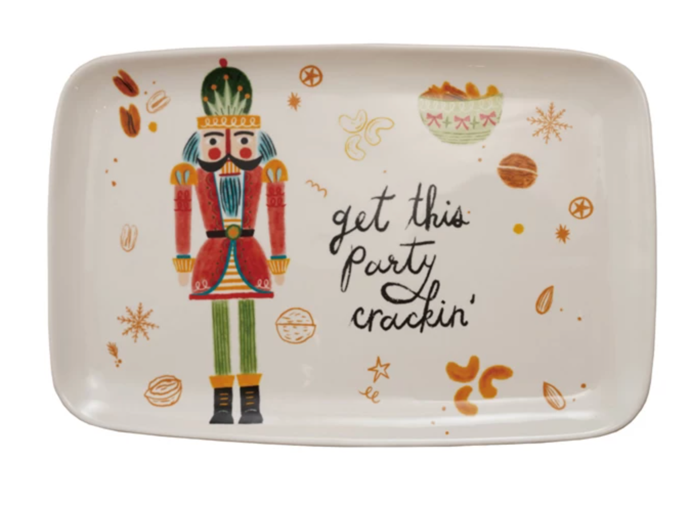 Elevate your gatherings with the Stoneware Platter featuring a playful nutcracker and the phrase "Get this Party Crackin." Crafted for durability and style, this platter is perfect for serving nuts, appetizers, or snacks while adding a fun, festive touch to your table. Its sturdy stoneware construction ensures long-lasting use, making it a must-have for entertaining with flair. Make every party memorable and inviting with this charming and functional serving piece.